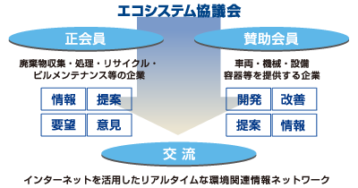 このような状況下において、廃棄物収集運搬・処理事業・リサイクル・ビルメンテナンス等の関連企業の方々を中心として、環境関連分野の様々な企業の皆様が 有機的に結びつき、廃棄物問題の解決の一翼を担うことを 目的にしております。私たちは、「資源循環型社会」を目指しており、「エコシステム協議会」の理念、設立主旨に対し、ご理解を賜わりますようお願いいたします。